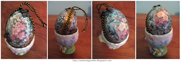 | I decoupaged this hollow egg many years ago. I used a variety of papers both with both metallic and matte surfaces. The butterflies are made of Filmo clay. Read more about how to decoupage a larger picture from either a napkin or paper onto an egg's surface. |