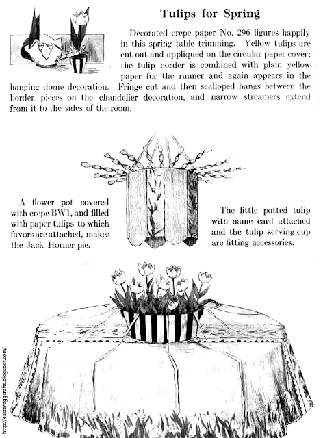 Decorated crepe paper tulip cup cake holders and tulip favors may be happily arranged on this spring table trimmed for Easter. Yellow tulips are cut out and appliqued on the circular paper cover; the tulip border is combined with plain yellow paper for the runner and again appears in the hanging dome decoration. Fringe cut and then scalloped hangs between the border pieces on the chandelier decoration, and narrow streamers extend from it to the sides of the room.
